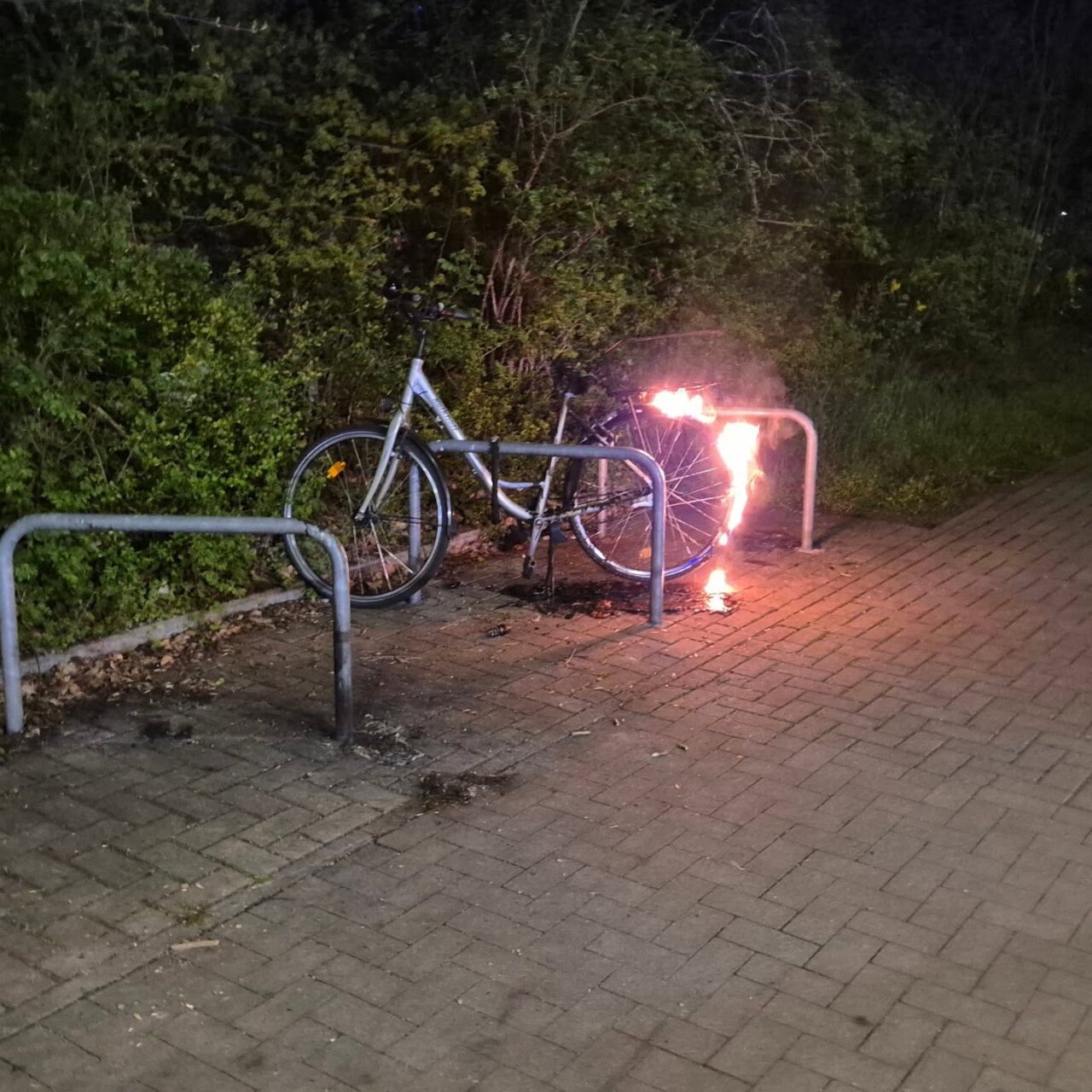 In der vergangenen Nacht wurden wir -mal wieder- zu einem brennenden Fahrrad alarmiert. Das Feuer konnte schnell abgelöscht werden. Die Polizei hat mehrere ähnliche Fälle inzwischen zusammengefasst, ermittelt wegen Brandstiftung