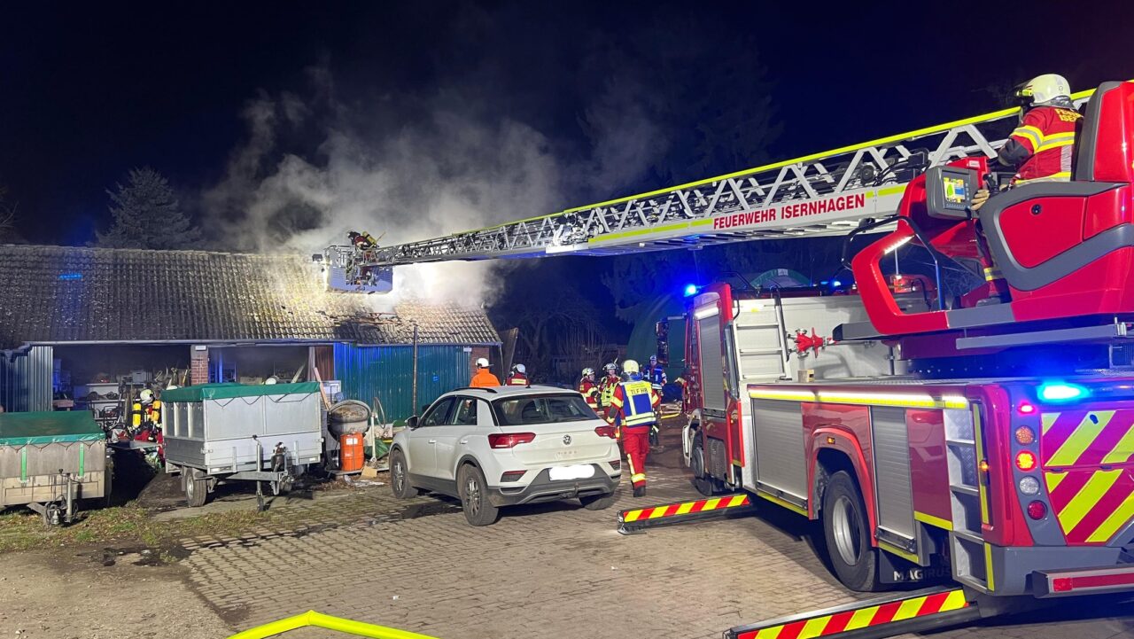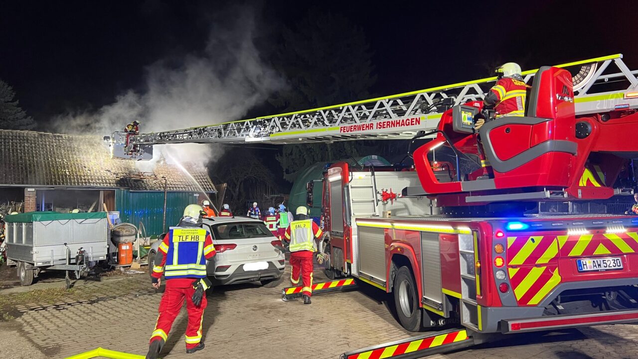 Am Dienstagabend wurde die Feuerwehr zu einem gemeldeten Gebäudebrand nach Isernhagen NB alarmiert. Zunächst lautete das Einsatzstichwort B1 – Feuer (Gebäude). Bereits nach kurzer Zeit bestätigte sich ein Brand im Dachbereich einer Scheune, sodass die Alarmstufe auf B2 – Dachstuhlbrand erhöht wurde.