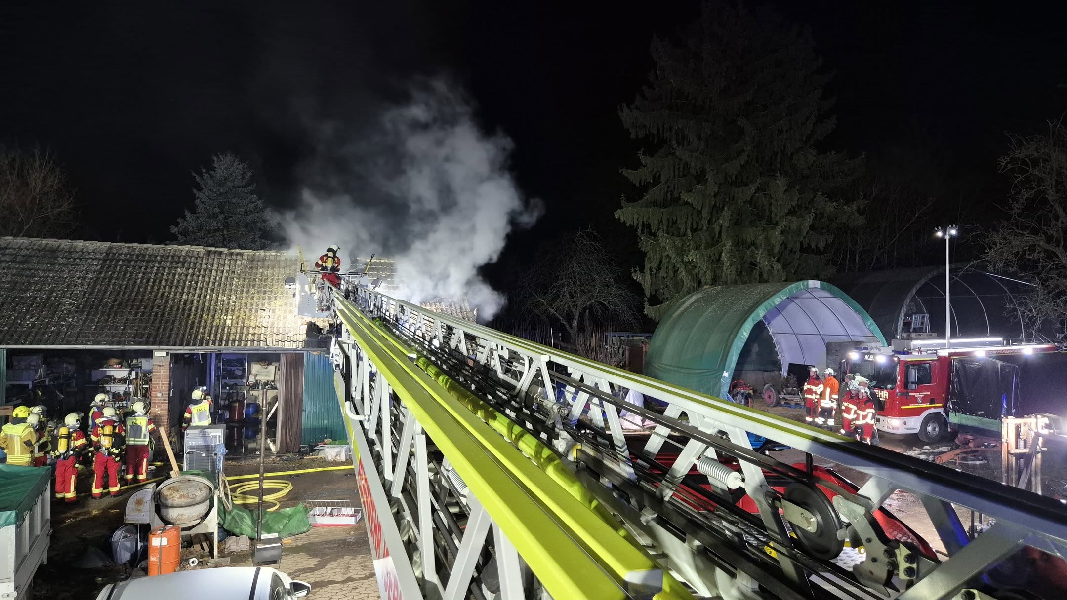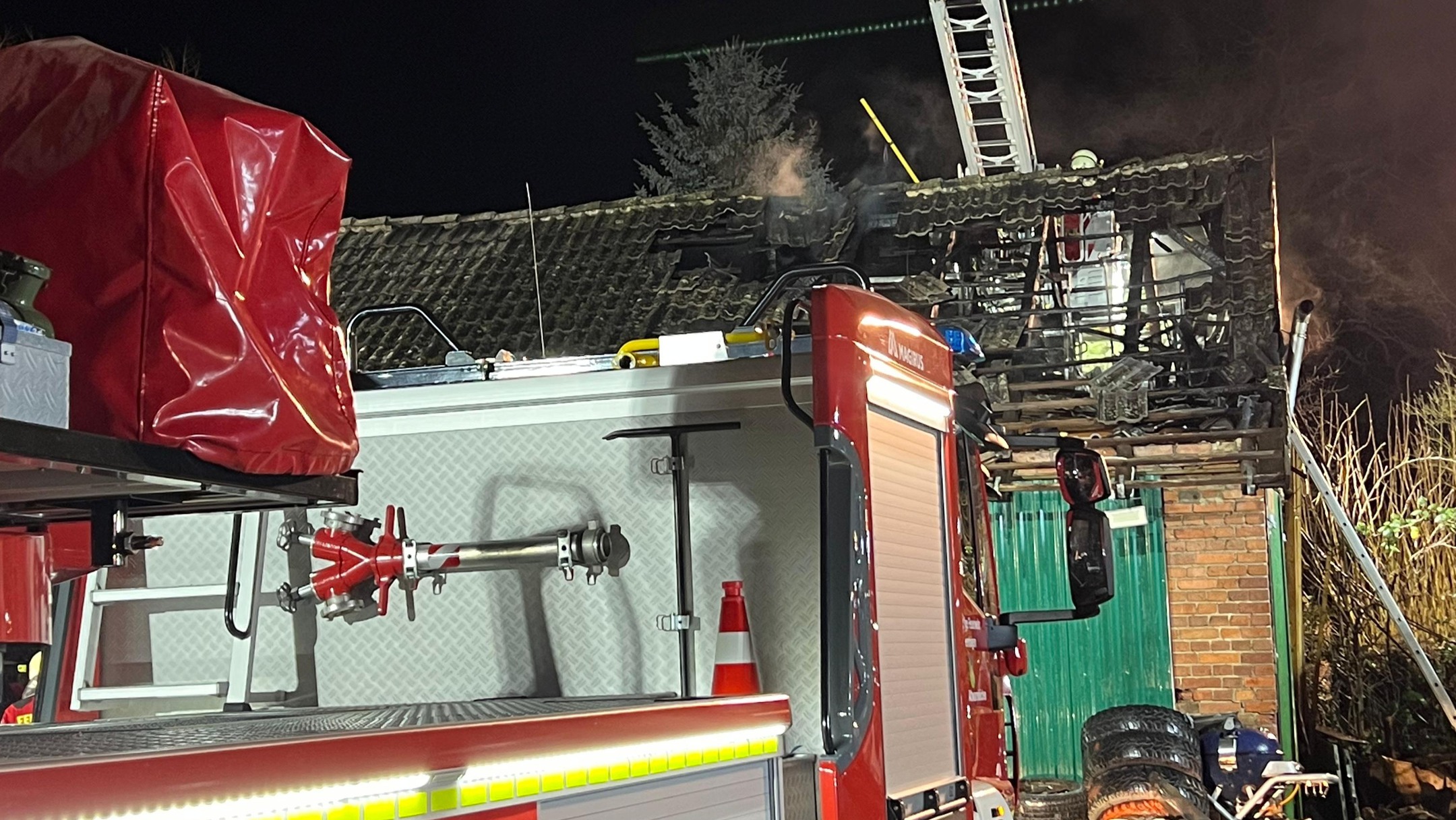 Beim Eintreffen der ersten Einsatzkräfte brannte es im Dachbereich der Scheune. Ersthelfer hatten bereits vor Eintreffen der Feuerwehr einen Minibagger aus der Halle gefahren und erste Löschmaßnahmen mit Feuerlöschern eingeleitet.