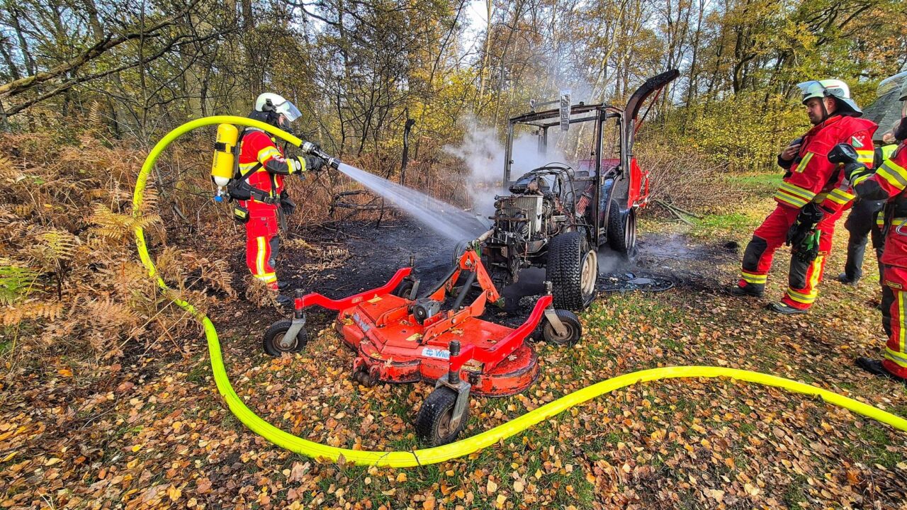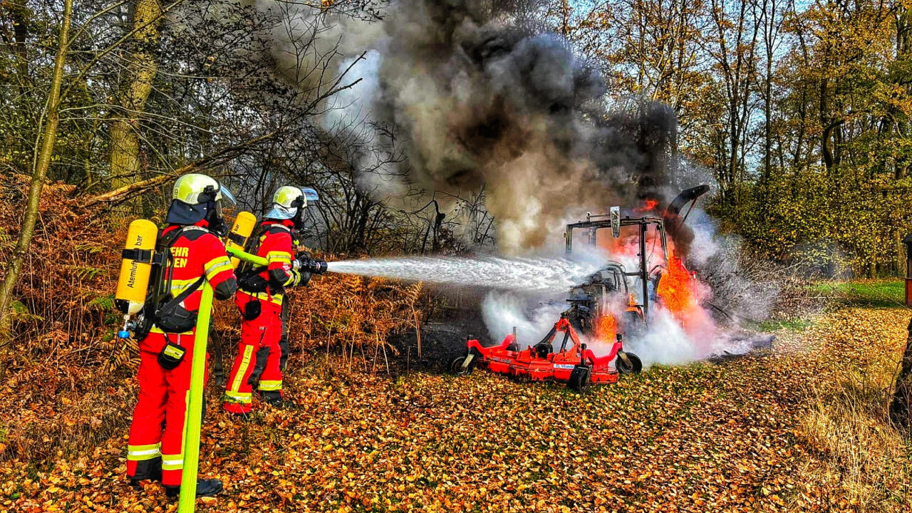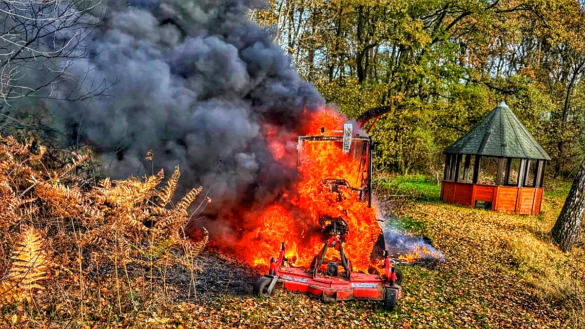 Mitarbeiter waren im hinteren Bereich des Geländes mit Gehölzpflegearbeiten beschäftigt, als ihr Kleinschlepper plötzlich Feuer fing. Sie konnten sich rechtzeitig in Sicherheit bringen und alarmierten umgehend die Feuerwehr.