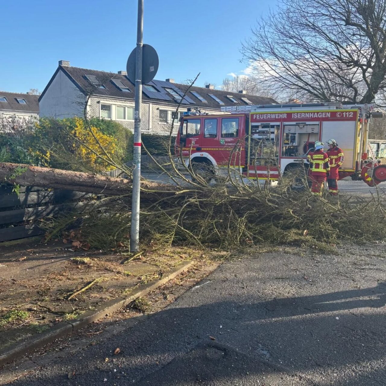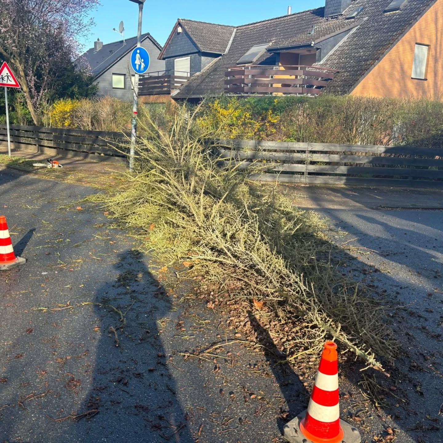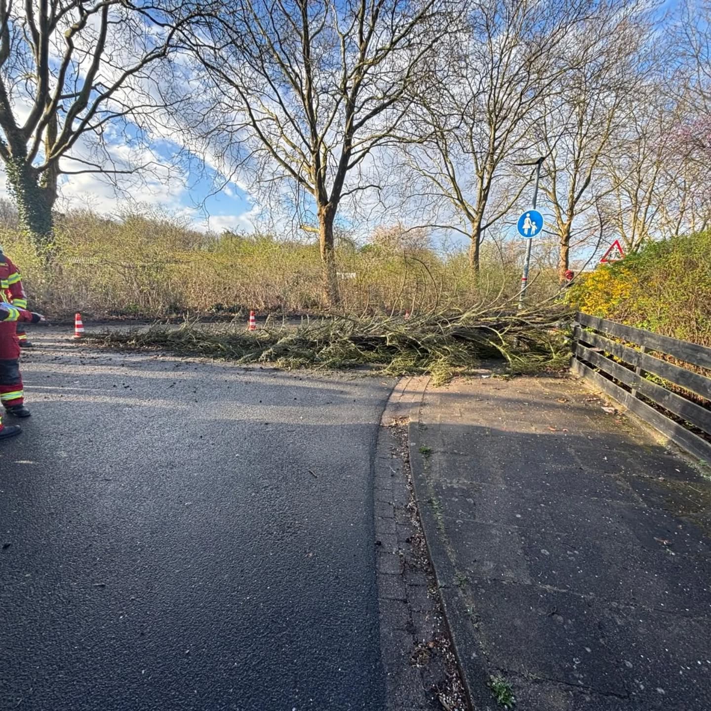 Die starken Böen am frühen Morgen hatten einen Baum zu Fall gebracht und die Straße blockiert. Mit der Kettensäge wurde der Baum entastet, der Stamm zersägt und anschließend von der Fahrbahn geräumt.