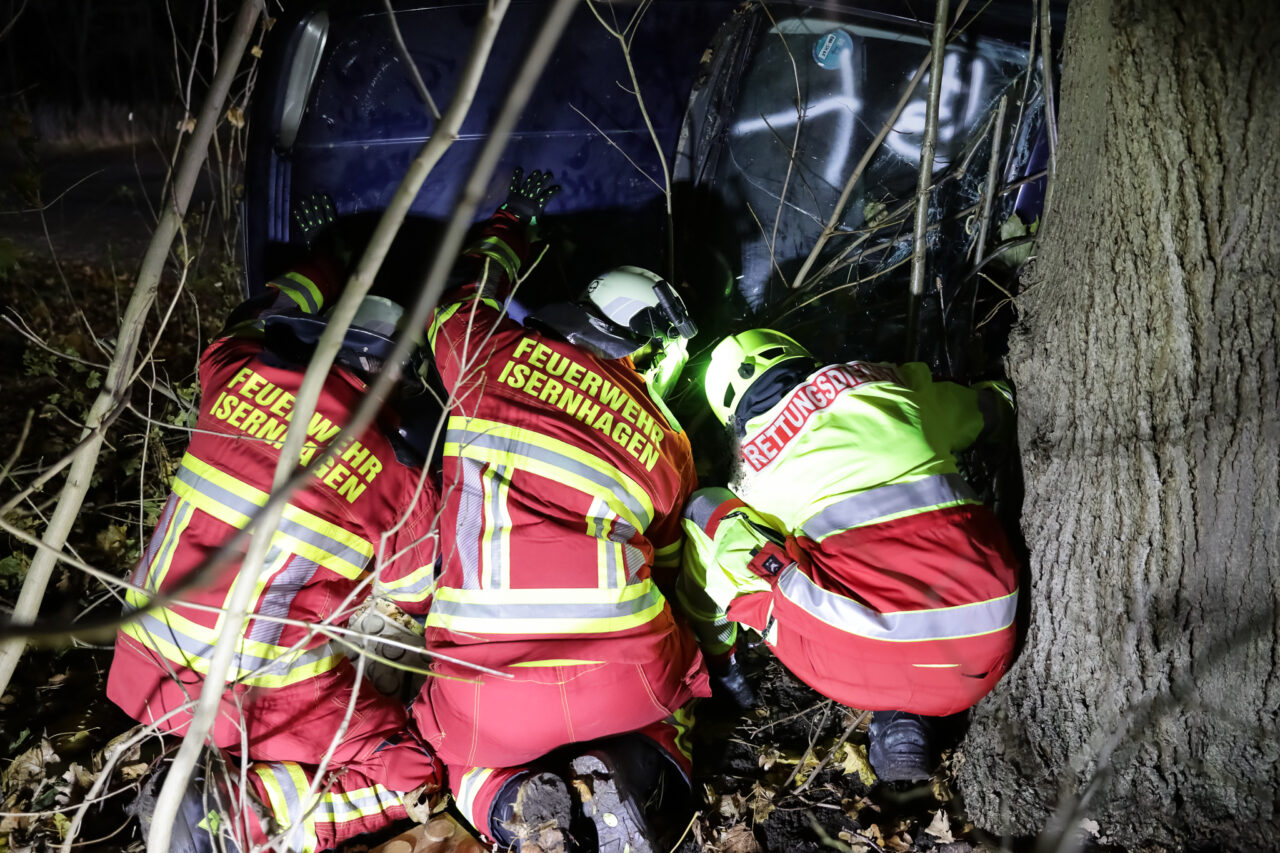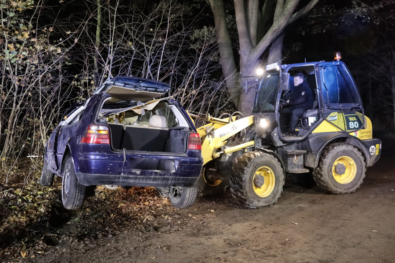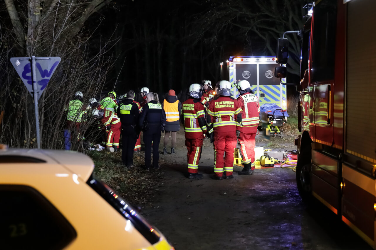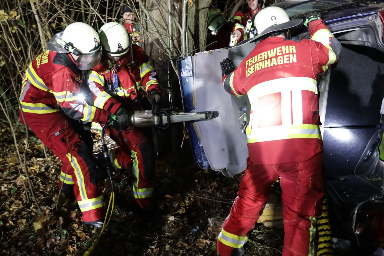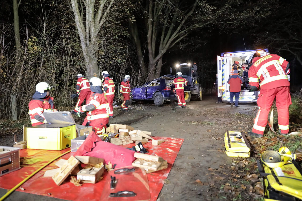 Ein VW Golf 4 war nach einem angenommenen Abkommen von der Fahrbahn auf die Fahrzeugseite gekippt und anschließend mit dem Dach gegen einen Straßenbaum zum Liegen gekommen. Der Fahrer – dargestellt durch Sven Nawroth – war im Innenraum eingeschlossen und mit einem Arm unter der Fahrertür eingeklemmt. Die Anlehnung des PKW am Baum erhöhte die Komplexität der Lage deutlich, insbesondere hinsichtlich Stabilisierung, Zugangsöffnung und Rettungstaktik.