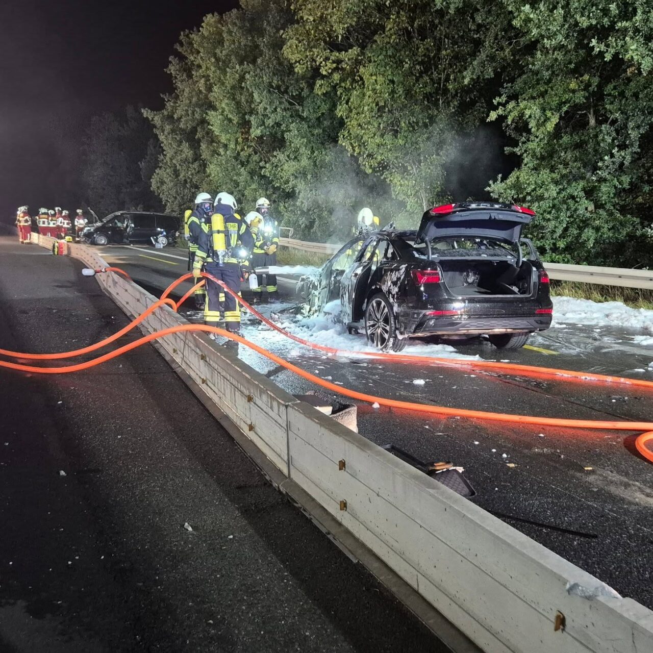 Vor Ort bestätigte sich die Meldung: Ein Fahrzeug stand lichterloh in Flammen, ein zweites war stark beschädigt gegen eine mobile Schutzplanke geprallt, die dabei erheblich verschoben wurde. Während die Kräfte aus Heeßel die Brandbekämpfung übernahmen, suchten wir nach möglichen weiteren Unfallbeteiligten.